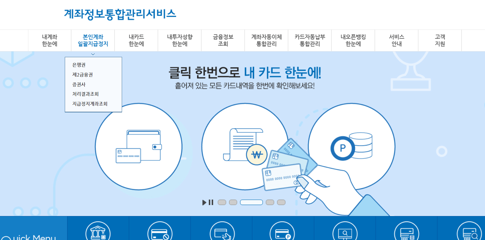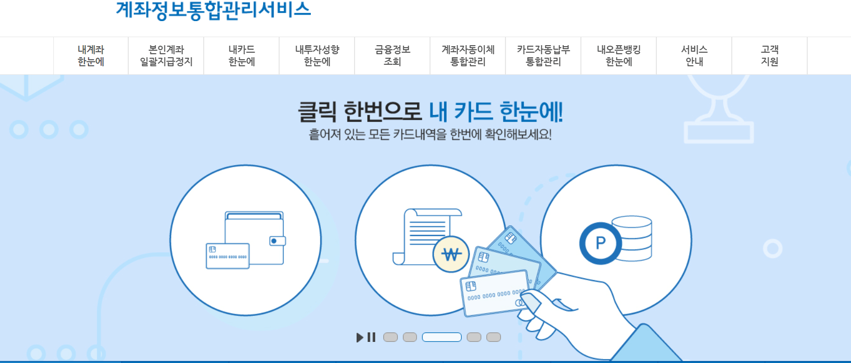어카운트인포는 금융당국 정책(국민체감형 금융거래서비스)에 의거 국민의 금융편의 제고를 목적으로 도입된 금융기관 공동서비스로서 누구나 자신의 계좌 ‧ 카드 ‧ 보험 등 숨은 금융자산을 한 번에 조회하고 관리할 수 있게 도와주는 서비스입니다. 계좌통합관리서비스는 금융기관 공동의 서비스로서 금융결제원에서 관련 시스템을 구축 및 운영합니다.