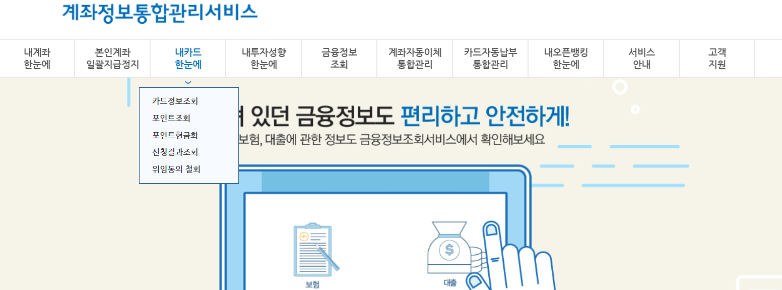 해당 서비스에서는 내 명의로 발급된 모든 카드내역 한 번에 확인이 가능합니다. 카드의 세부 정보와 이용하고 있는 서비스에 대해 궁금하면 해당 카드를 클릭하면 자세히 확인이 가능합니다. 그리고 본인이 발급카드가 아닌 경우 또는 사용하지 않는 카드의 경우 해지가 가능합니다. ‘내 카드 한눈에’ 서비스에서 가장 중요한 서비스는 ‘포인트현금화’ 메뉴입니다. 현재 내 명의의 카드에 남은 카드포인트 조회가 가능하며 이를 현금으로 즉시 지급받을 수 있는 서비스입니다. 서비스 조회 후 바로 남아있는 포인트가 있다면 이를 현금으로 본인 계좌에 입금받으시기 바랍니다.