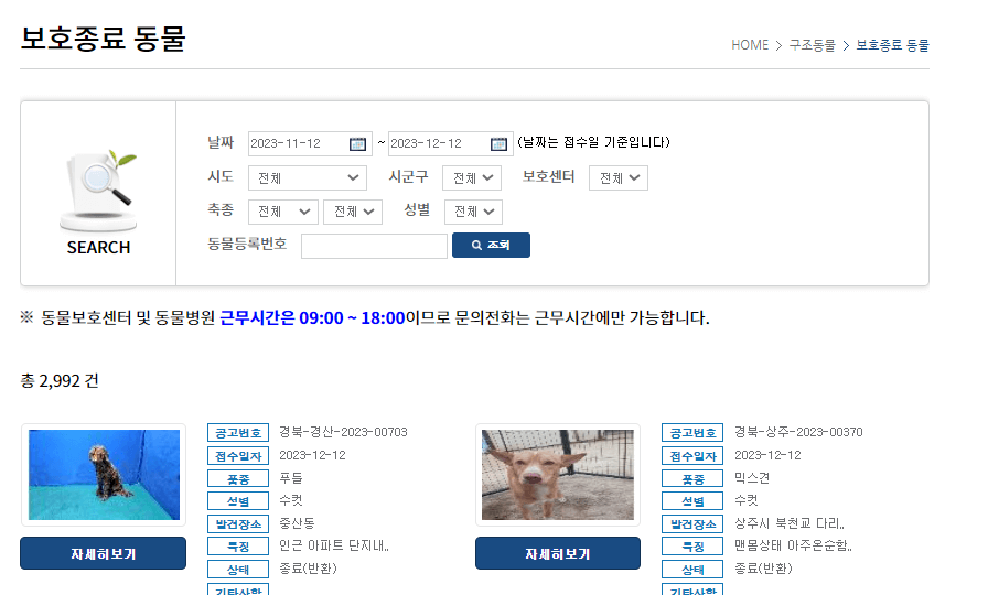 국가동물보호정보시스템 사이트에 접속하면 메뉴에 ‘구조동물’이라고 있습니다. 구조동물 중 ‘보호 중인 동물’을 선택하면 전국 지역별 현재 보호소에서 보호 중인 유기견의 현황을 한눈에 볼 수 있습니다. 보호 중 동물에서는 강아지 품종, 특징, 상태, 발견 장소 등의 정보가 등록되어 있으며 자세히 보기를 클릭하면 보호센터명, 보호센터 연락처를 확인할 수 있습니다. 이 사이트에서는 유기견뿐만 아니라 고양이 등 유기묘에 대한 정보까지 확인이 가능합니다.