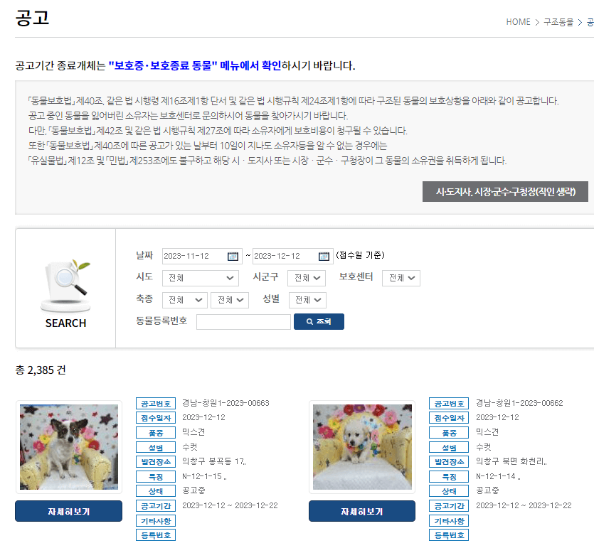 2. 유기견 무료분양 사이트 ‘국가동물보호관리시스템’ 활용