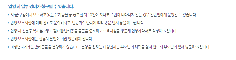 - 입양 시 신분증 복사본 2장과 필요한 반려동물 물품을 준비하고 보호시설에 방문하여 입양계약을 작성해야 합니다.